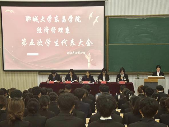 2025年10月10日,经济管理系第五次学生代表大会在日新楼C202隆重举行。本次大会由2025届学生会执行主席崔晓丹主持,经济管理系党总支书记徐宏霞、校团委组织部副部长周希芹、系团总支负责人王昕钰、校学生会主席团成员车雨柯及各兄弟系部代表等嘉宾应邀出席,我系专职辅导员、特邀嘉宾、70名列席代表及全体正式代表共同参会。