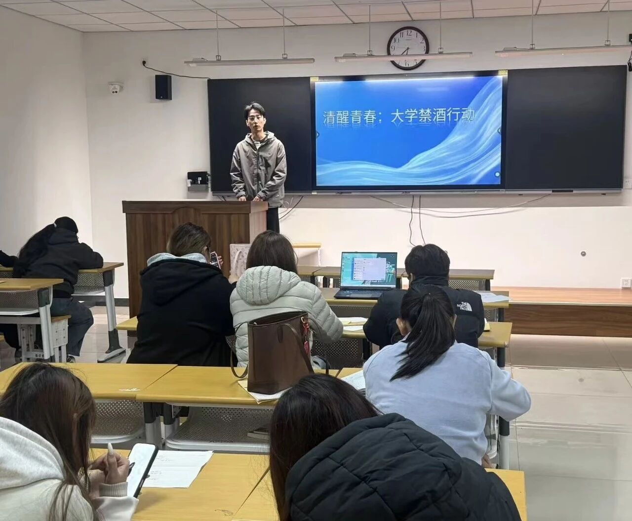 班会伊始,辅导员以“看得见的危害”为切入点,借助精心制作的PPT,深入剖析了校园内的真实案例。这些案例包括因酒后情绪失控引发同学冲突、饮酒行为对集体凝聚力的破坏,以及酒后危险行为对校园秩序的干扰等内容。通过这些身边事例,同学们直观而深刻地认识到饮酒对个人与校园环境造成的负面影响。
