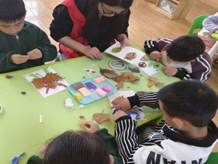 在激发了孩子们对落叶的兴趣后,活动进入了最令人期待的手工制作环节。在志愿者“小老师”的引导下,孩子们用黏土捏出眼睛与嘴巴,辅以树枝、小草等自然材料进行装饰。原本普通的树叶在孩子们的巧手下,化身为一个个独具个性的“树叶精灵”。