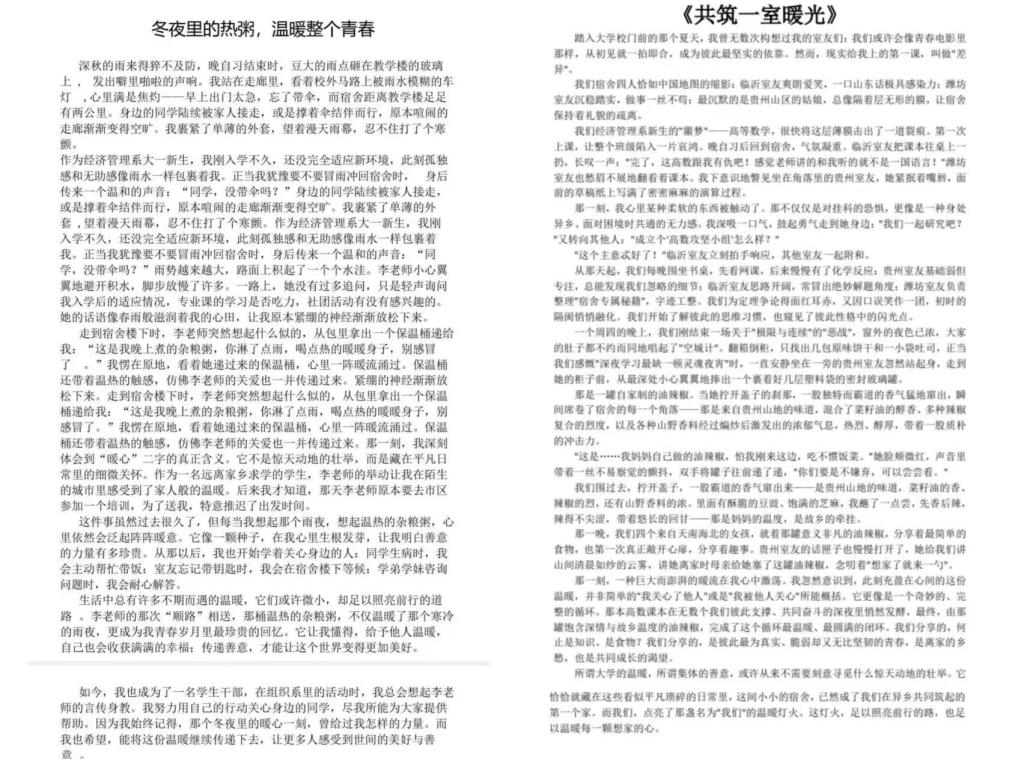 在文字作品中,同学们以细腻的笔触定格下一个个难忘的瞬间:有人深情回忆某个雨天,老师默默递来的雨伞与一碗温热的杂粮粥,那份关怀不仅驱散了身体的寒意,更点燃了传递善意的决心;也有人娓娓道来与室友分享家乡美食的故事,简单的品尝与交谈,让彼此从陌生走向熟悉,渐渐成为求学路上坚实可靠的伙伴。这些文字让平凡却温暖的“一刻”跃然纸上,成为了可被感知与可被珍藏的记忆。