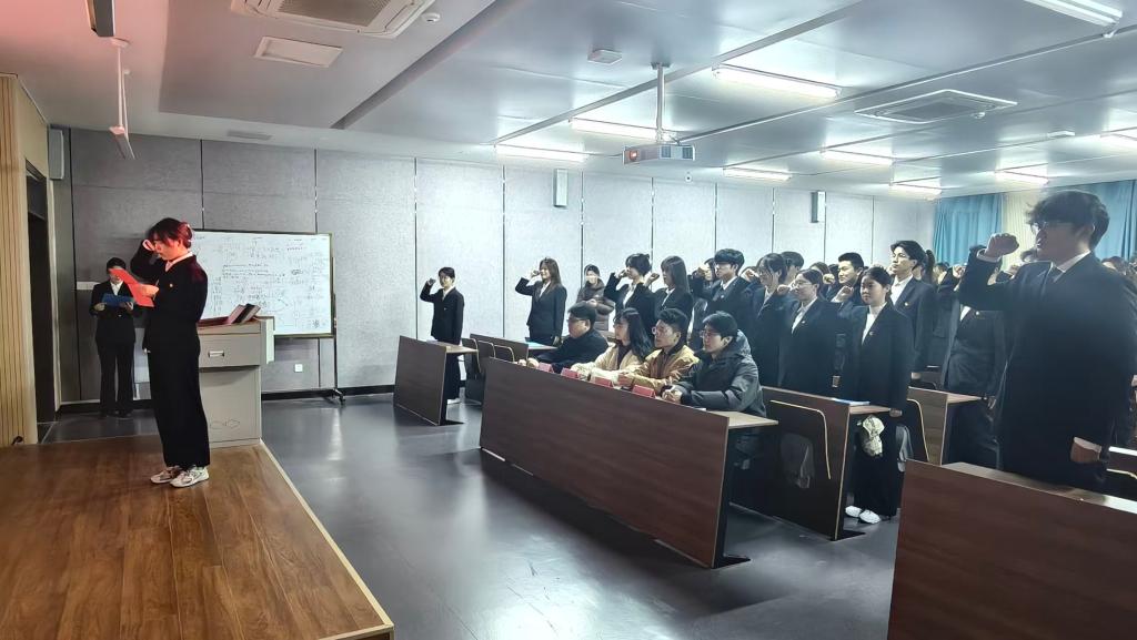 为践行这份崭新的责任,在团建部副部长疏佳的领誓下,全体新团员面向团旗,举起右拳,庄严宣誓:“我志愿加入中国共产主义青年团……”铿锵的誓言在会场内回荡,标志着他们正式成为先进青年组织的一员,开启了追求进步的新篇章。
