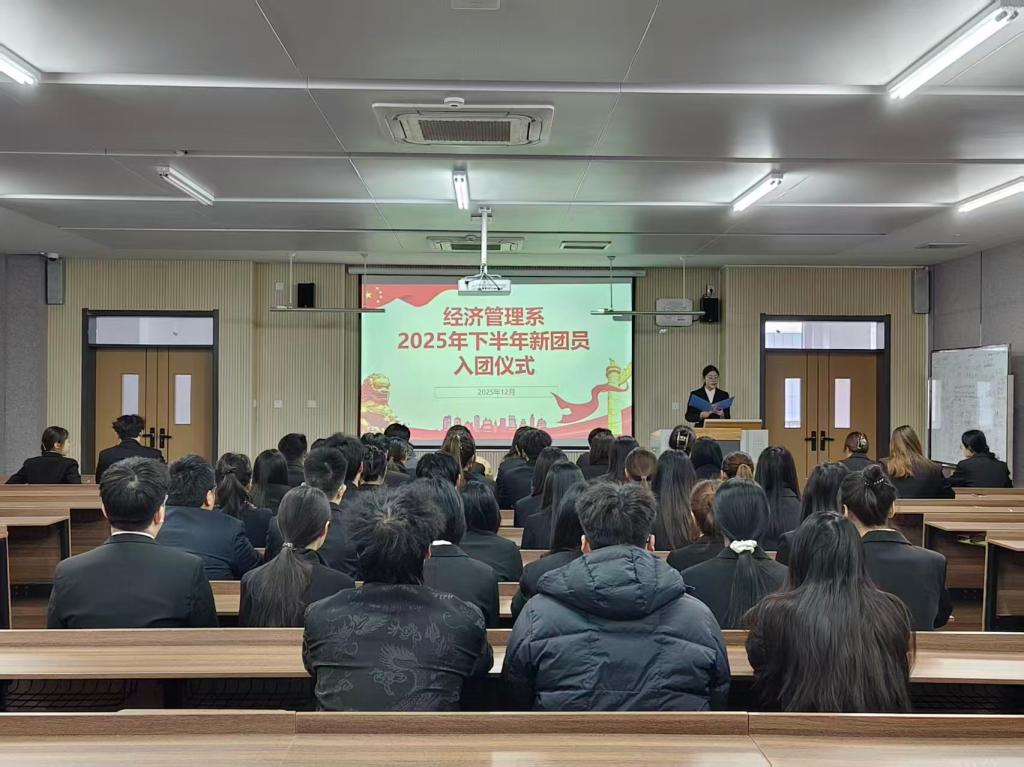 为凝聚青春力量、深化仪式教育育人实效,12月26日,经济管理系在日新楼C401举行2025年下半年新团员入团仪式。我系团总支负责人王昕钰,专职辅导员孙强、陈林、秦庆帅及全体新团员参加此次仪式。