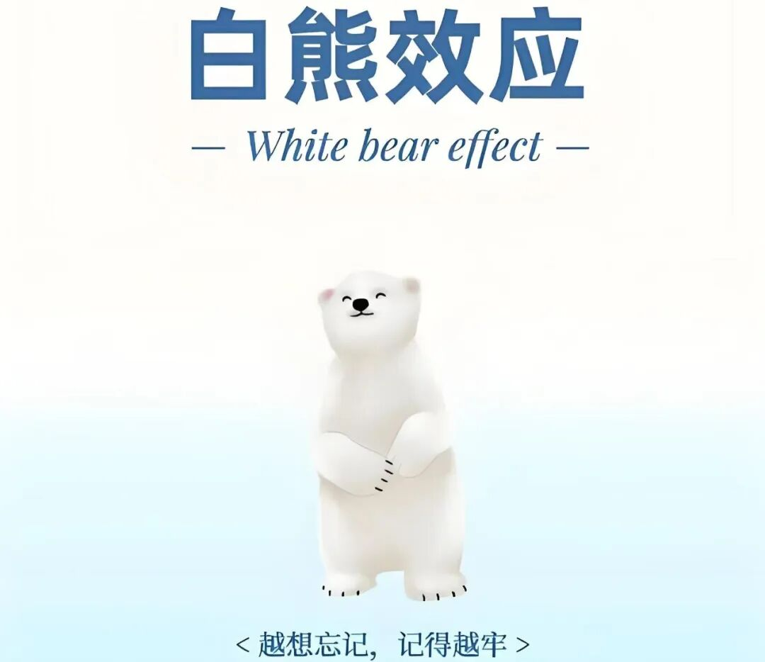 白熊效应,又称反弹效应,是指当人们试图压抑或忘记某个想法、记忆或冲动时,越是刻意压抑却越忘不掉,因为在你提示自己要忘记的同时,也是对信息再确认,加深的过程。